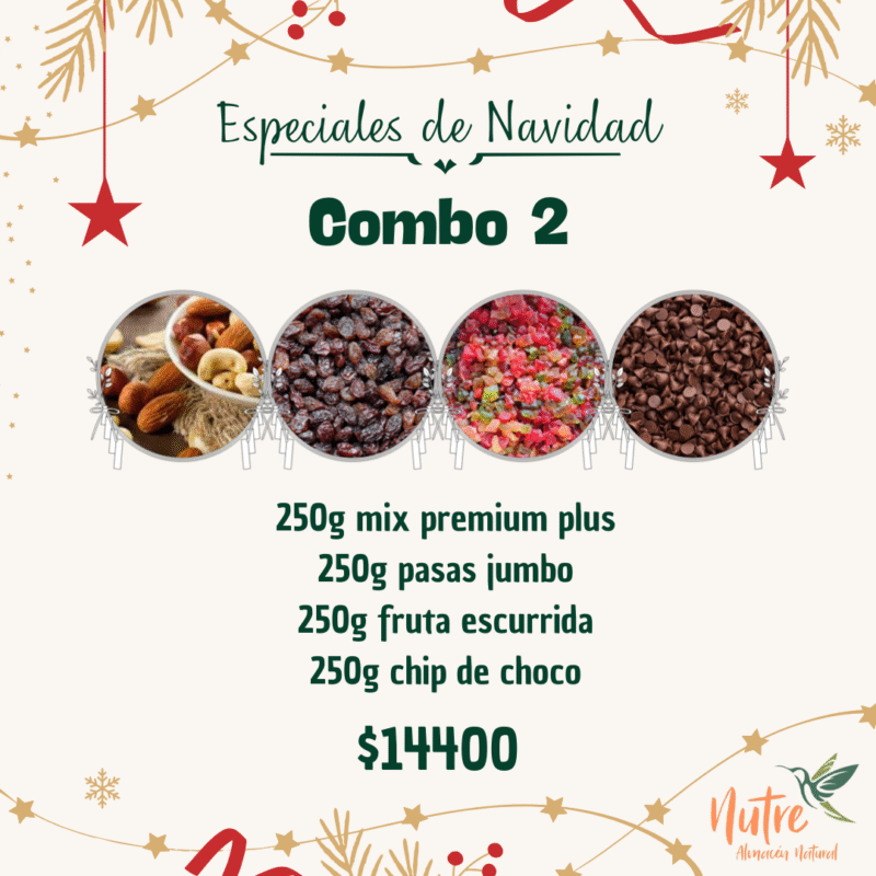 250g mix premium plus, 250g pasas jumbo, 250g fruta escurrida y 250g chip de choco